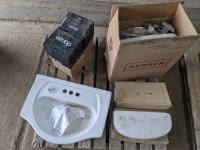 Gerber wall hung lavatory 19 inch x 17 inch, 4 inch cc; 24 inch semi-cast vanity with 4 inch cc; (3) toilet tank lids; (2) Danze shower heads and pressure balance valves