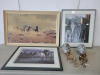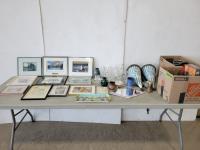 Qty of signs, frames, beach body P90X, outside clock, small tent, Heys duffle bag, wooden shelf and qty of foam floor mats