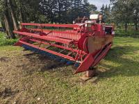 Honey Bee HB0030 30 ft double delivery rigid draper header, pickup reel, variable speed reel, manual fore & aft, self contained header transport, manual dial for canvas speed, A/C, radio, 18.4-26 front tires, 14L-16.1SL rear tires