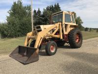 Loader, 84 inch bucket, Case 6 cylinder diesel engine, 8 speed manual transmission, cab, 540/1000 PTO, 2 rear hydraulic outlets, 10.00-16 front tires, 18.4-34 rear tires