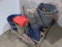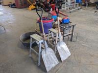 Feed buckets, water buckets, (2) salt blocks, (2) shovels, saddle stand, bird feeder, (2) two step aluminum ladders