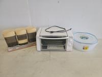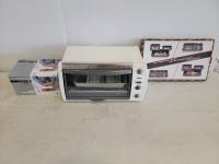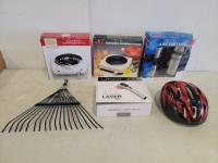 rake head, Salton hot plate, Bon Appetit hot plate, m/l bike helmet, Arcosteel thermos and (2) mugs, handheld laser