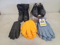 (11) pairs of fabric gloves, leather gloves, men's size 10 Penman's shoes, men's size 9 Cougar boots