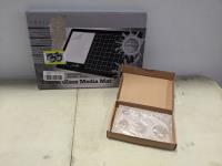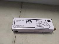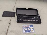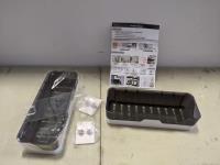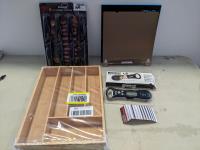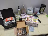 Face masks, 125 ft fish tape, (4) ladder platforms, 4 inch - 4-3/4 inch fire extinguisher holder, 3 inch polishing discs, exam gloves, (3) wire stripper/crimpers, screwdriver, 1-15/16 inch 1 inch drive socket, 27 piece letter stamp set