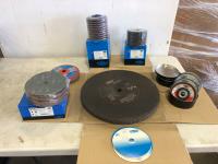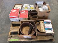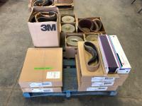 (5) surface conditioning belts 6 inch x 79 inch, (2) 25 inch x 60 inch 36 grit belts, (6) 1-1/2 inch x 8 inch deburring wheels, (20) 6 inch P600 fiber discs, (130±) 5 inch fiber discs, (9) 3 inch x 132 inch sanding belts, 5 inch fiber discs of various grits, (10) 4 inch x 36 inch 80 grit sanding belts