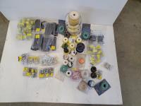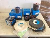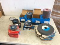 (48) 6 inch fiber disc rolls P100 and P800, (7) 2 inch x 90 inch surface conditioning belts, (20) 5 inch fiber discs of various grits, (4) 6 inch fiber discs of various grits, (5) fiber disc bags, assorted sanding belts, (6) 8 inch x 1-1/2 inch deburring wheels