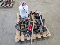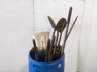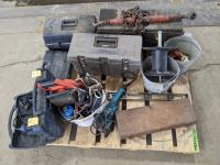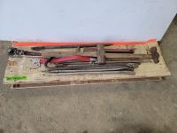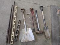 (2) pry bars, (2) levels, aluminum scoop shovel, track shovel, tire chain pliers, sledge hammer