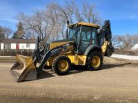 Enclosed cab, A/C, 4 speed powershift transmission, pilot controls on seat arms, electric backhoe/excavator selection mode, left hand reverser, 90 inch smooth loader bucket, 24 inch dig backhoe bucket, Q/C coupler, hydraulic thumb, extendable stick, stick aux hydraulics, 12.5/80-18 front tires, 500/70-24 rear tires