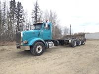 Caterpillar C15 6NZ 15.2 6 cylinder 475 HP engine, positive air shutoff, Eaton Fuller 18 speed manual transmission, flat top 48 inch sleeper, A/C, radio, CB radio, hydraulic wet kit, moose bumper, Tulsa hydraulic winch, air ride suspension, 12,860 lb front axle, 46,000 lb rear axles, full lockers, 240 inch WB, rear live roll, tow hitch, all aluminum wheels, 11R24.5 tires