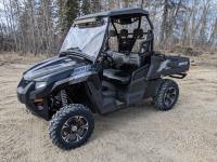 1000 cc fuel injected water cooled engine, automatic transmission, Hi/Lo range, reverse, enclosed cab, heater, windshield, power steering, front winch, front locking differential, front brush guard, manual dump box, receiver hitch, independent suspension, rear screen, upgraded rims, 30X9.00-14 front tires, 30X11.00-14 rear tires
