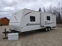 Sleeps 6, stove, fridge, microwave, full bath, master bedroom, bunk beds, A/C, outdoor kitchen, outdoor shower, 2 slides, power awning, power levelling jacks, spring suspension, electric brakes, (2) 30lbs propane tanks, radio, tv, comes with dishes and appliances, 225/75R15 tires