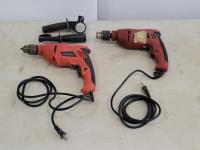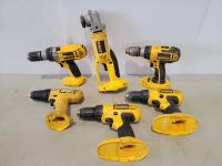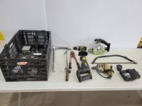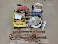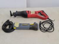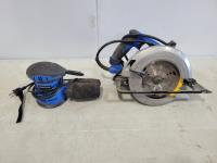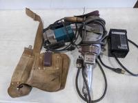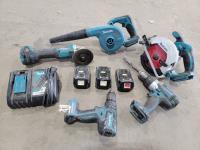 circular saw, (2) drills, (3) batteries, charger, blower, grinder