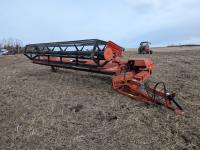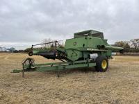 John Deere 914 14 ft pick-up header, variable speed reel, reverser, rock trap, yield & moisture, chaff spreader, chopper, grain tank extensions, A/C, radio, DMC Combine Calc-U-Dri II, 30.5L-32 front tires, 14.9-24 rear tires