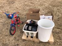 (4) leather cowboy hats, (2) wooden Face decorations, (1) kid's bike, wooden chair, vacuum, meat grinder, electric hot plate, (2) pan roller pans, metal storage box filled with hats, travel pack, wok, etc.
