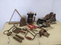 Skates, iron, bee smoker, clippers, drill, shears