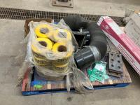 Roll of canvas material, qty of poly, various hardware, 4 way cross wrench, waterproof membrane, paint roller tray, circular saw blades, ice melter