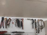 bolt cutters, pipe wrenches, hacksaw, clamp, part roll of chain, hand seeder, pry bars, hammers, truck chain plier, miscellaneous tools