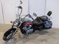 mustang seat, backrest cargo holder, upgraded foot pegs and handlebars, has saddle bags and carrier, red two tone paint, front tire 120/90-17 M/C, rear tire 170/80-15 M/C