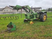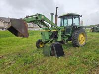 John Deere loader, 72 inch bucket, bale forks, John Deere 6.6 L 6 cylinder diesel engine, 95 PTO HP, 8 speed partial synchro transmission, open station platform, 540/1000 PTO, 2 rear hydraulic outlets, 18.4-30 rear tires