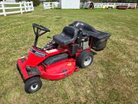 Briggs & Stratton 14 HP single cylinder engine, 5 speed manual transmission, rear bagging system