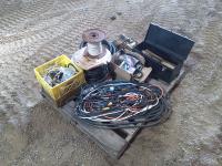 12 volt beaver winch, (3) galvanized truck half fenders, battery charger, skid steer tire and rim