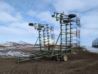 6 inch spacing, 9 inch sweeps, Degelman 3 bar spring tooth harrows, walking axles on main frame, walking axles on wings, 7.60-15 tires