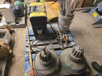 (3) Welding Helmets, (2) boxes of welding rods unopened, Bosch cordless drill with charger, (3) 30 ft Dyna Lock self retracting lanyards, Makita corded angle grinder, welding gauges, miscellaneous climbing gear
