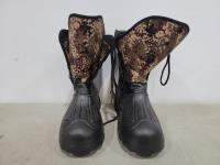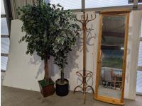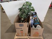Artificial plant, (4) lamps, vase, (2) horse brass wall hangings, shoe covers, helmet, overshoes, ice cleats