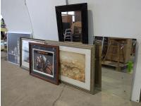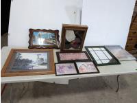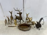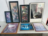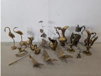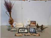 (2) vintage solid brass pheasants, (3) framed pictures, (3) word art wall hangings, (2) vintage white Persian ceramic cats, vintage glass ball fishing float