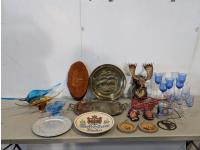 Blue glass wine glasses, stein, silver serving tray, platters, vintage glass art, wooden clock