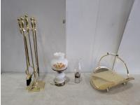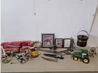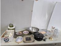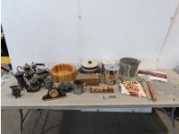 Barbeque utensils, ice buckets, flour sifter, mantle clock, vintage iron, silver plate tea and coffee services, utensils