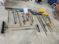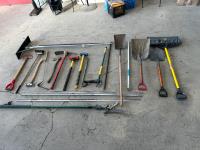 Shovels, axes, pry bars, pruning saw, sledge hammers, pickaxes