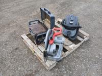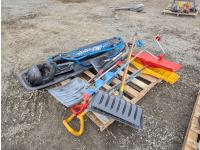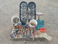 (1) Mallet Axe, (2) Snow Shovels (one plastic, and one Metal), (1) Broad Mouth Metal Shovel, (3) Spade Shovels, (2) Hoes, (1) Metal Edger/Scrappers, (1) Fire place/Wood stove Shovel, (3) Metal Rakes, (2) Lawn Rakes, (1) Salt/Seed Spreader