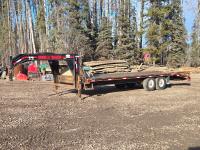 100 inch wide deck, 60 inch beaver tails, wood deck, flip over ramps, electric brakes, torsion suspension, ball hitch, rub rails, stake pockets, aluminum deck tool box with 10,000 LB electric winch, spare, 14 ply tires, 7000 lb axles, 235/85R16 tires