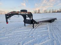 102 inch wide, 31 ft deck, spring assisted 5 ft full ramps, dual jack landing gear, left side cargo winch's, front tool box, 7000 lb axles, electric brakes, spring suspension, spare tire, 14 ply 235/80R16 tires