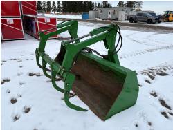 John Deere 633 loader, Q/A, 80 inch bucket, grill guard, 90 HP, diesel engine, 24 speed Auto Quad partial power shift transmission, 50 Km top speed, cab, joystick, A/C, radio, air ride seat, buddy seat, 540/1000 PTO, 3 point hitch, 4 rear hydraulic outlets, 480/70R28 front tires, 580/70R38 rear tires