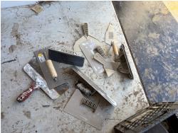 Dry wall tools, basket of staple guns, and small hand tools, tire chain repair tool