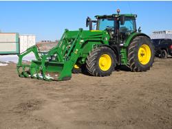 John Deere loader, Q/A, grapple, mid mount hydraulic connection, 6 cylinder 155 HP, diesel engine, DEF required, IVT transmission, cab, left hand reverser, rear differential lock, joystick, A/C, upgraded stereo, air ride seat, buddy seat, 540/1000 PTO, 3 point hitch, 4 rear hydraulic outlets, rear wheel weights, 600/56R28 front tires, 719/70R38 rear tires