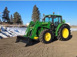 John Deere 633 loader, Q/A, 80 inch bucket, grill guard, 90 HP, diesel engine, 24 speed Auto Quad partial power shift transmission, 50 Km top speed, cab, joystick, A/C, radio, air ride seat, buddy seat, 540/1000 PTO, 3 point hitch, 4 rear hydraulic outlets, 480/70R28 front tires, 580/70R38 rear tires