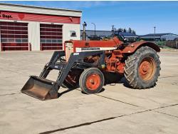 Loader, 60 inch bucket, International 6 cylinder 80 HP, diesel engine, 76 PTO HP, 8 speed manual transmission, open station platform, 540/1000 PTO, 3 rear hydraulic outlets, 7.50-20 front tires, 18.4-34/15-34 rear tires
