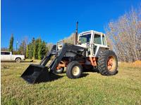 Ezee-on loader, 60 inch bucket, 48 inch bale forks,International 6.8 L 6 cylinder 140 HP, diesel engine, 126 PTO HP, 8 speed manual transmission, cab, 540/1000 PTO, 3 rear hydraulic outlets, 11L-15 front tires, 18.4-38 rear tires