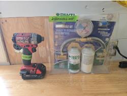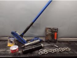 Snow brush, fluid transfer pump, air pumped grease gun, temp gauge, safety chain, new hole saw