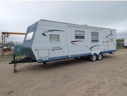 Sleeps 4, stove, fridge, microwave, master bedroom, A/C, outdoor shower, 3 slides, manual awning, power levelling jacks, spring suspension, electric brakes, 235/80R18 tires