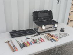 (1) Stainless "Maximum" tool box, (1) ball peen hammer, (1) steel flat file, (1)round steel file, (7) piece screw driver set, (1) plyers, (1) needle nose plyers, (1) square nose plyers, (1) long reach, round nose plyers, (1) vice grips, (1) wire brush, (1) metal square, (1) carpenter's pencil, (14) piece wrench set, (1) sliding T bevel gauge, (1) laser level, (1) drill bit set.
