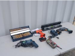 (1) Mastercraft electric drill, (1) Mastercraft large drill bit set, (1) Black and Decker cordless drill with (1) lithium battery, (1) Mastercraft cordless drill with (1) battery and charger, (1) Mastercraft digital multi reader, (1) Johnson level, tool combination in case.