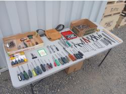Large socket set, (3) plyers, (5) wire cutters, (3) rachets, (1) universal converter, (31) screwdrivers, (1) Techo Master socket set, (10) socket extensions, (4) piece drill bit set, (5) piece rachet screw driver set, with multiple bits, (2) steel files, (8) chisels, (1) hook pry bar, (1) ruler, (12) wrenches, (1) small leather tool belt.