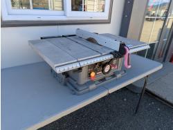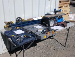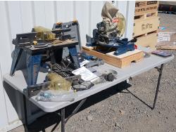 (1) Compound miter saw with extra 10 inch blades, (1) 3/8 inch drill, (1) router table.