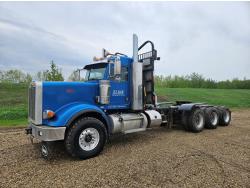 Caterpillar C15 15.2 L 6 cylinder engine, engine brake, positive air shutoff, Eaton Fuller 18 speed manual transmission, flat top sleeper, air ride driver seat, radio, CB radio, steel moose bumper, aluminum tool boxes, chain holders, hydraulic winch, air ride suspension, 18,000 lb front axle, 58,000 lb rear axles, full lockers, 4.33 ratio, all aluminum wheels, 425/65R22.5 front tires, 11R22.5 rear tires