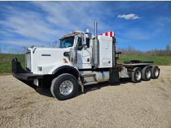 Caterpillar C15 14.6 L engine, Eaton Fuller 18 speed manual transmission, two speed auxiliary transmission, air ride driver seat, radio, steel headache rack, beacons, chain holders, 2011 custom bed, air operated rear live roll lift, Braden 35 ton (70 HP) hydraulic winch, full lockers, 4.30 ratio, 239 inch WB, air ride suspension, air assisted front suspension, 20,000 lb front axle, 46,000 rears, 425/65R22.5 front tires, 11R24.5 rear tires, odometer changed at 54131 km