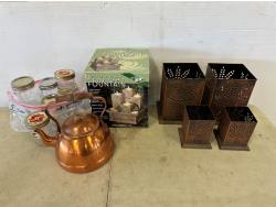 Copper kettle, candle holders, jars